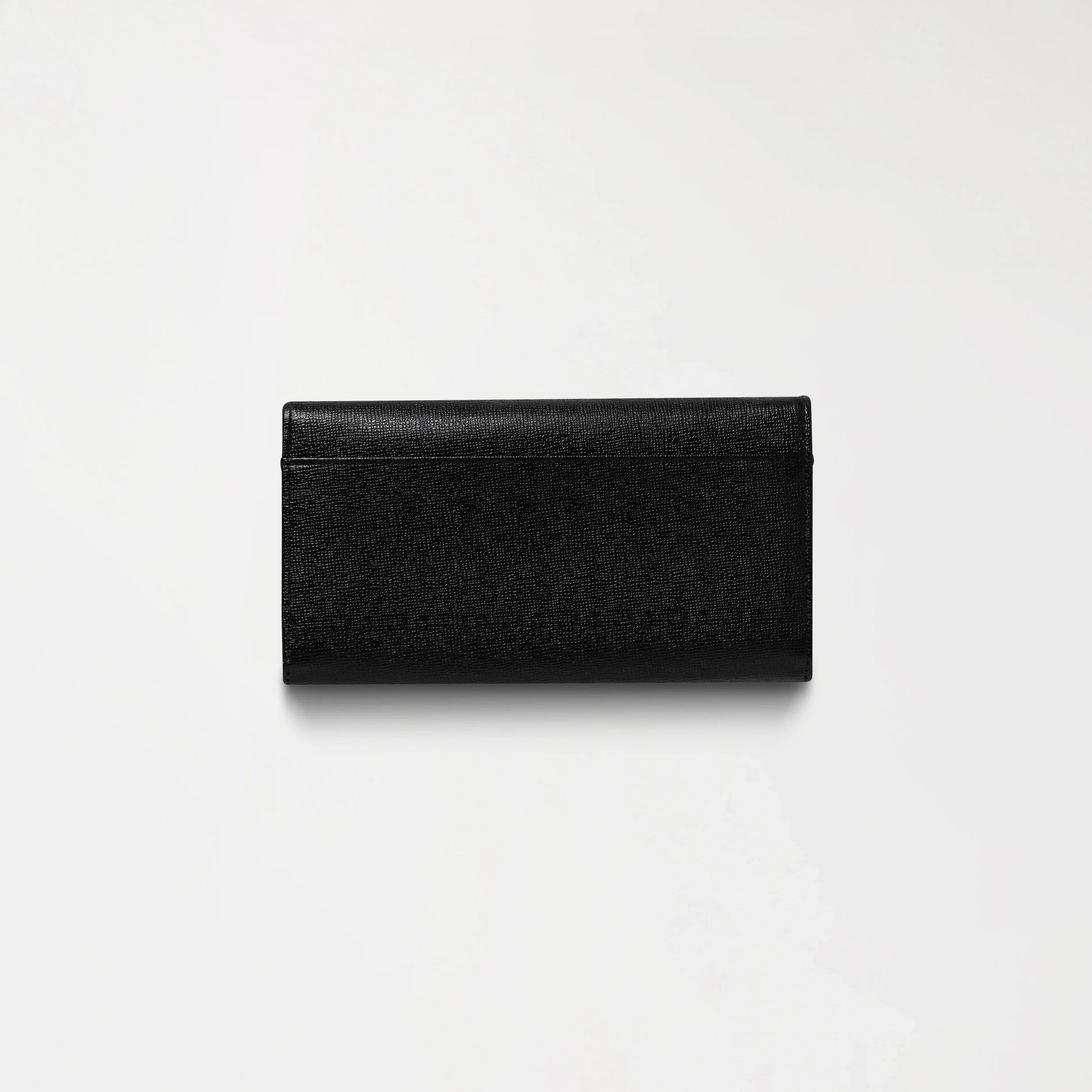 Billetera de mujer tipo sobre, elaborada en cuero de alta calidad, ideal para quienes buscan un accesorio con estilo y gran capacidad. Su diseño incluye un interior amplio, con dos compartimentos principales, un bolsillo central con cierre y múltiples ranuras para tarjetas, que permiten una organización eficiente. En el frente, incorpora un aplique metálico en tono plata brillante, que aporta un detalle sofisticado. El interior incluye la marca grabada en clisé, reflejando su identidad y acabado refinado, disponible en dos versiones de color: negro y rojo.