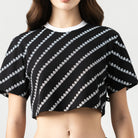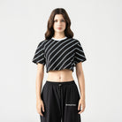 Britania es un crop top femenino confeccionado en algodón 100% exclusivo de Monastery. Su silueta pequeña se complementa con un fondeo total del logo TSM en repetición diagonal, creando un patrón dinámico y envolvente. El contraste de colores entre fondo y logotipo aporta fuerza visual, convirtiéndolo en una pieza ideal para quienes buscan estilo con personalidad.