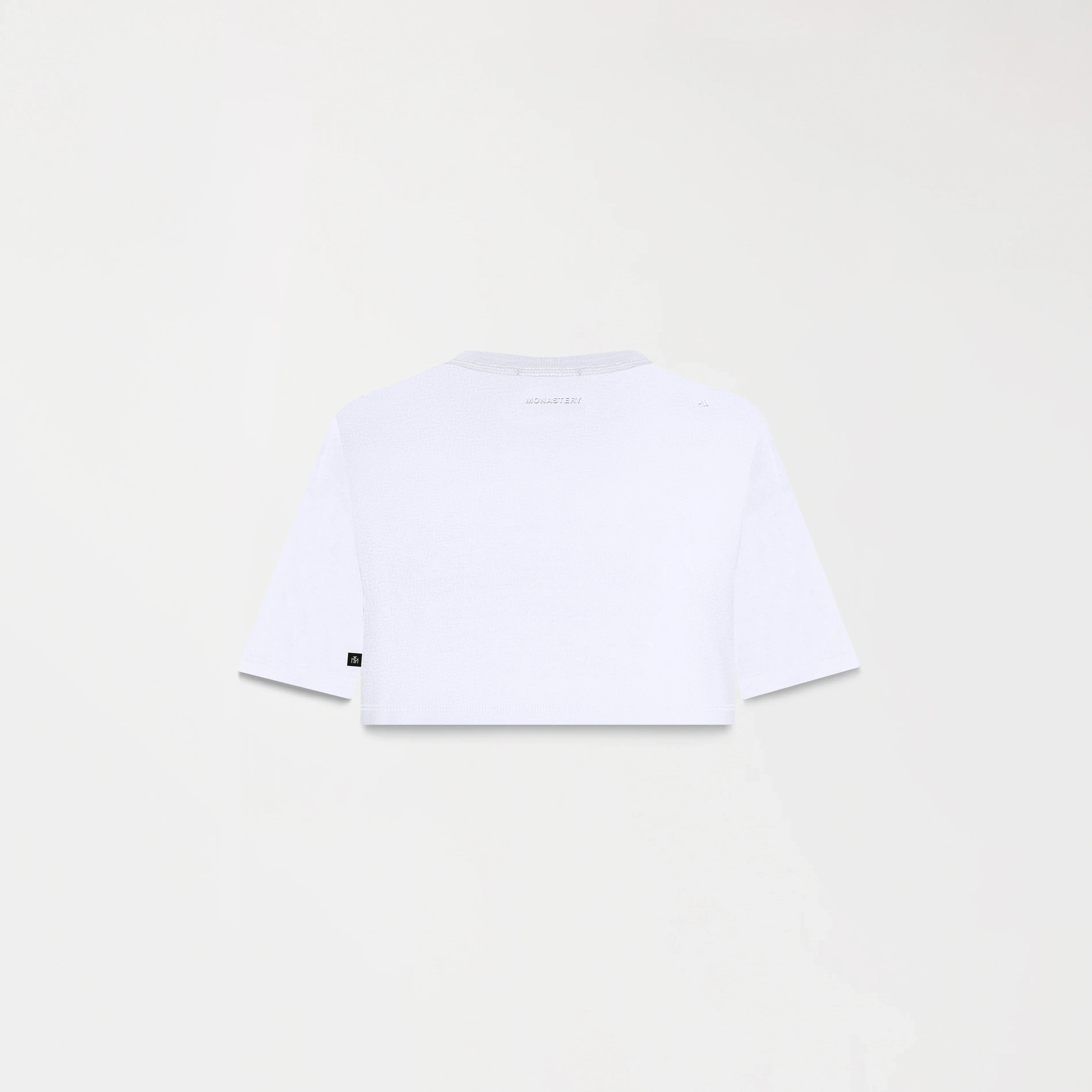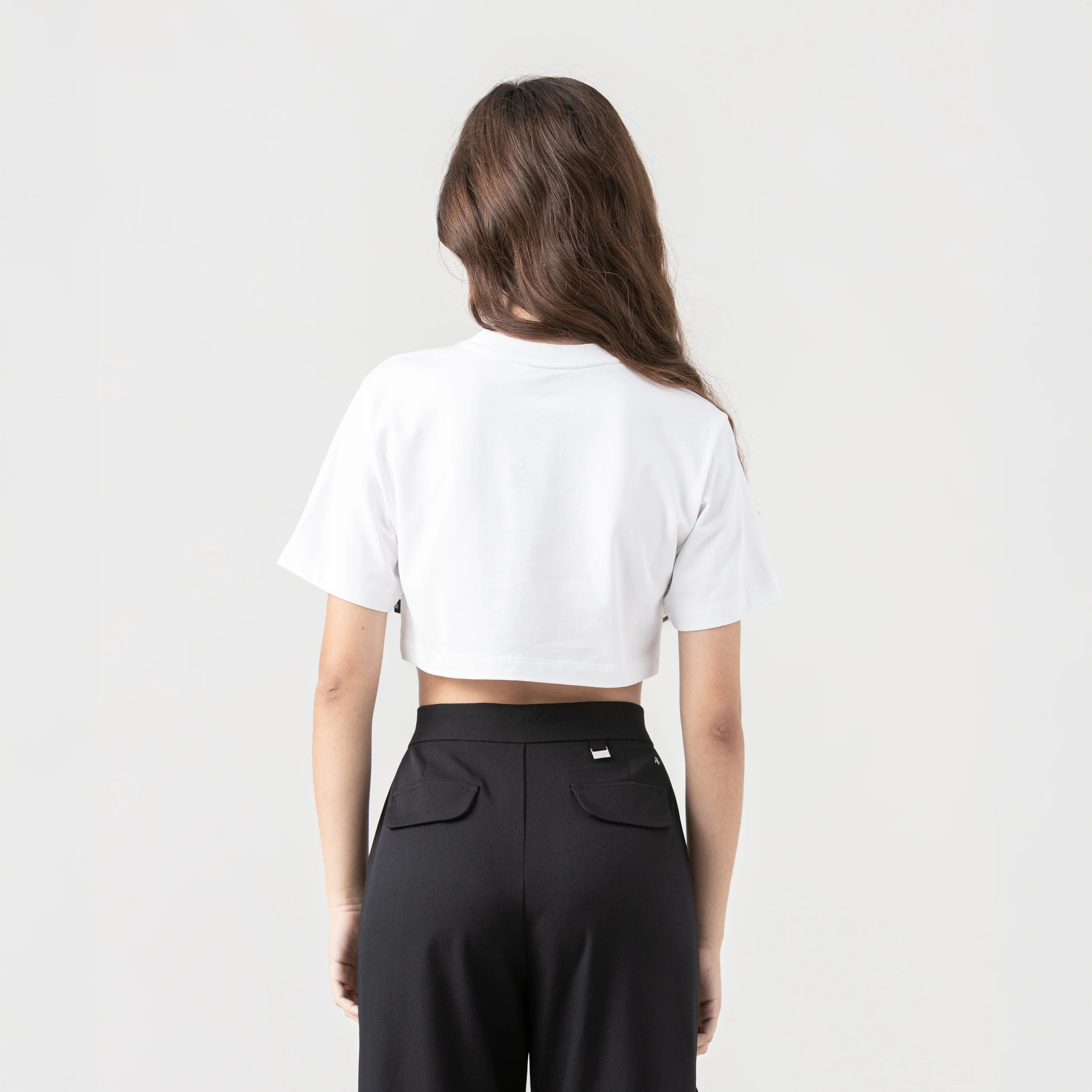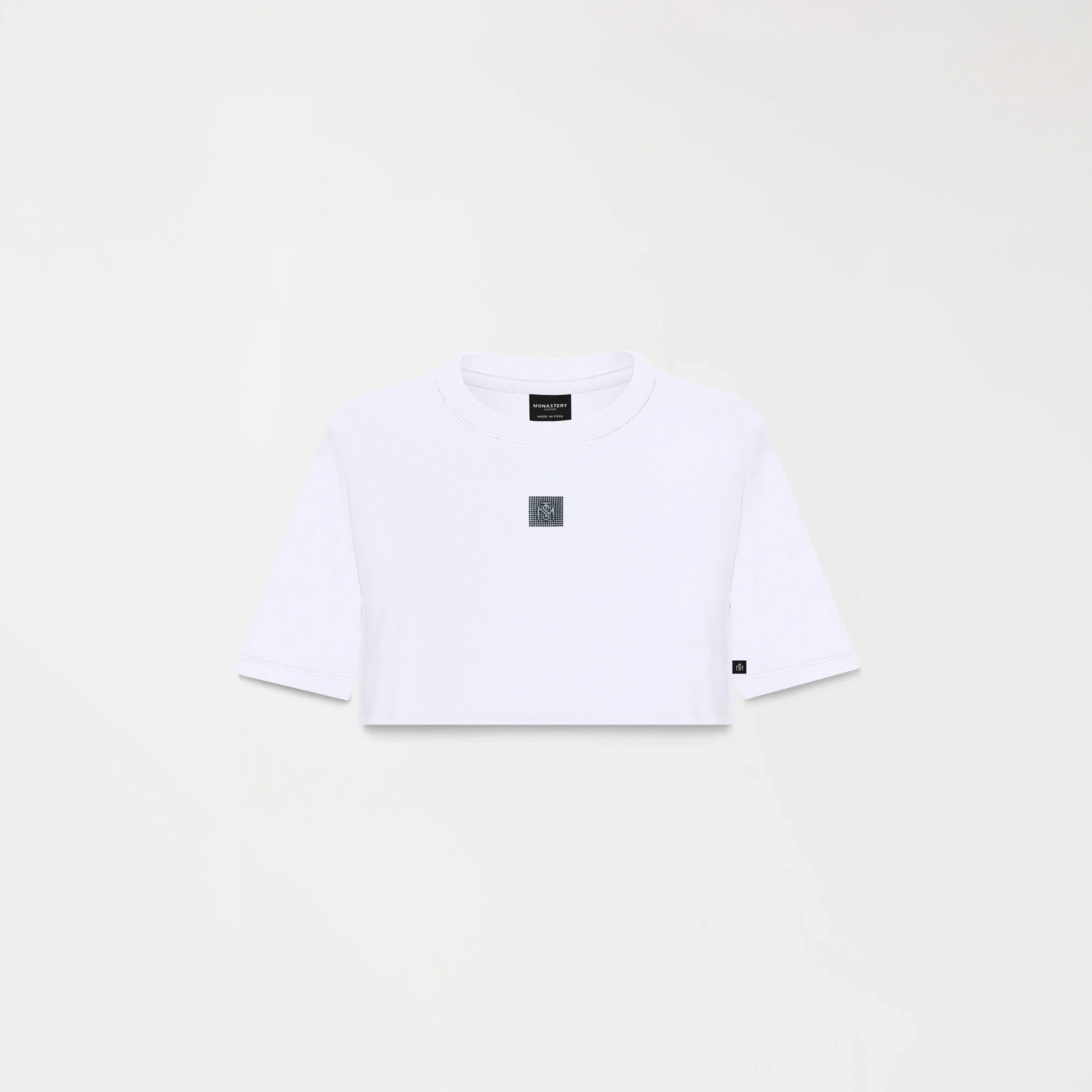 Naia es una prenda de silueta pequeña que destaca por su diseño elegante y minimalista. En el frente, luce un delicado aplique de cristales Swarovski, que aporta un toque de brillo y sofisticación. La parte posterior presenta los logos tradicionales de la marca aplicados en técnica plano, logrando un acabado limpio, sutil y duradero. Está confeccionada en algodón peruano de alta calidad, lo que garantiza suavidad al tacto, frescura y una excelente caída. Ideal para quienes buscan elegancia con una estética atemporal y refinada.
