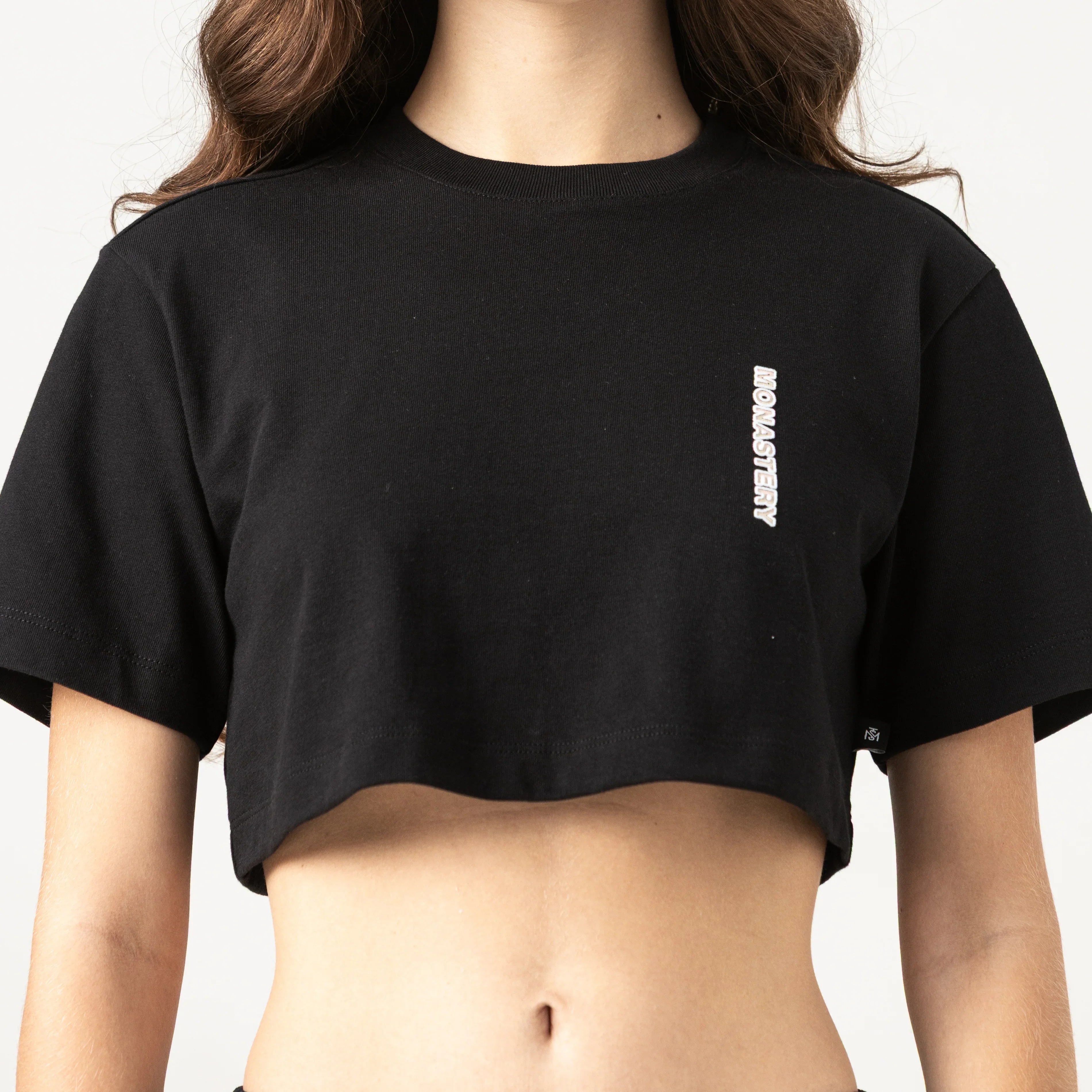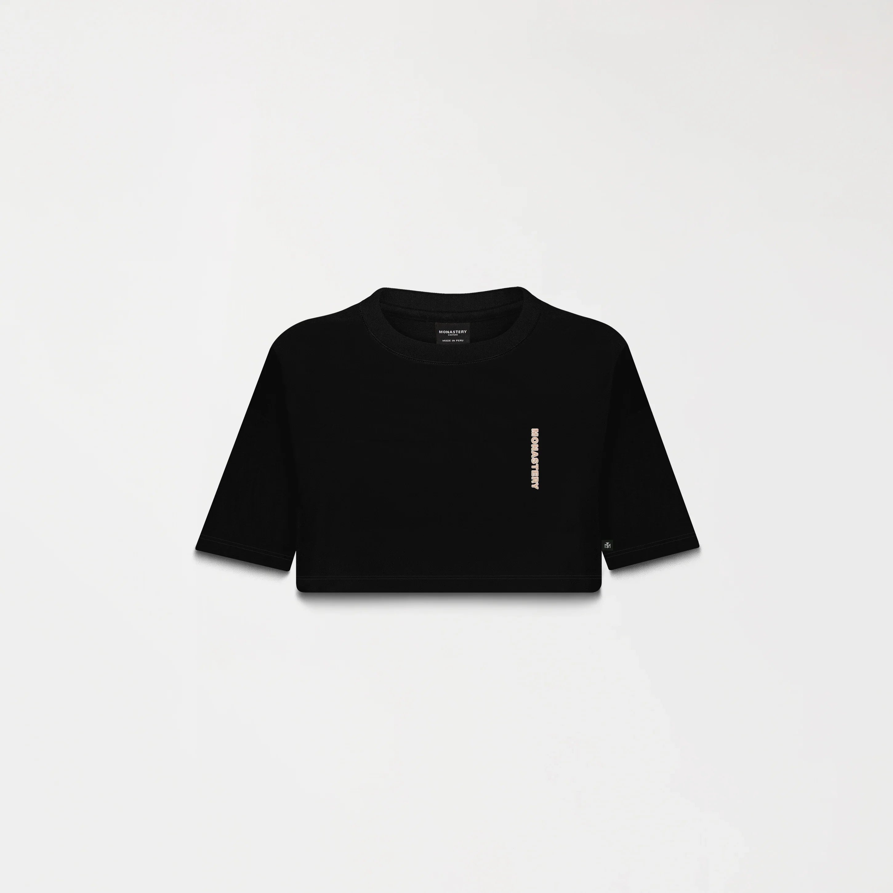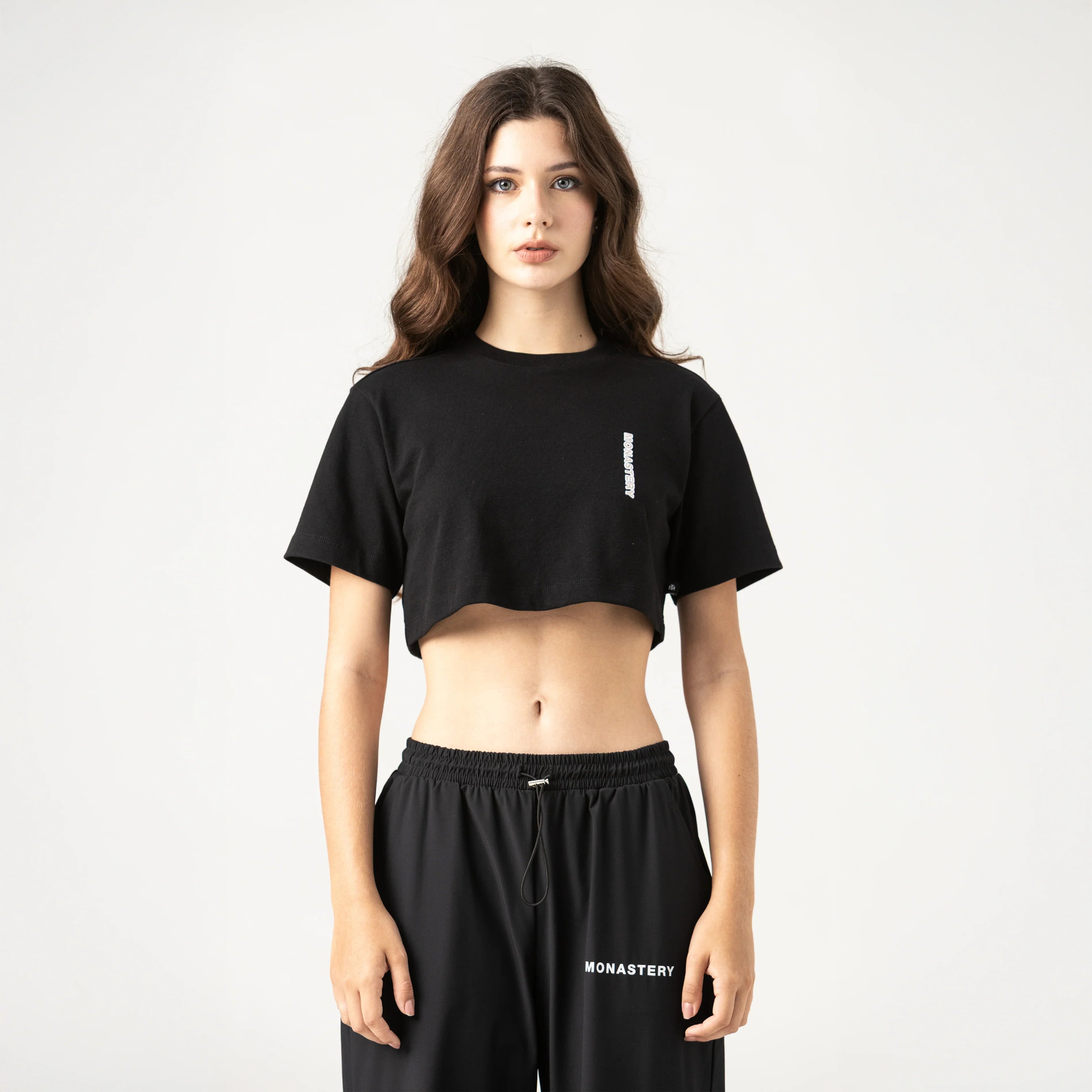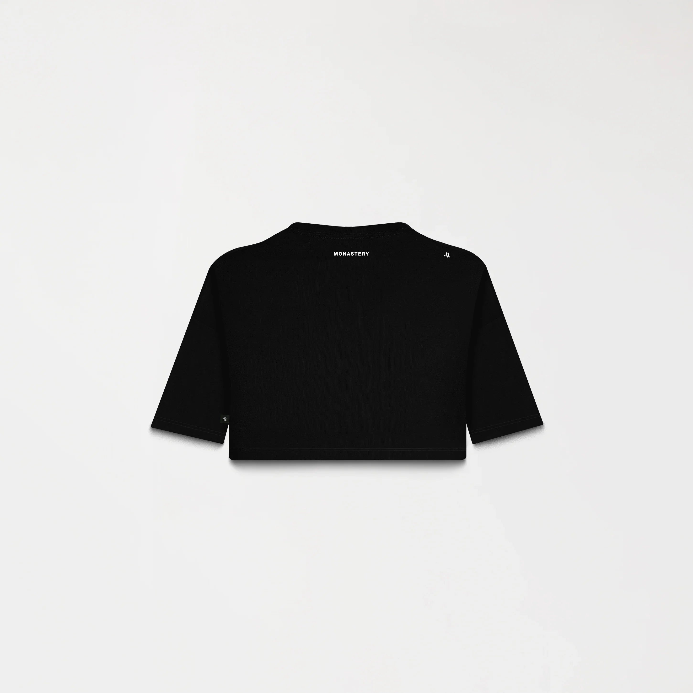 Crop top femenino en algodón 100% exclusivo para Monastery, silueta pequeña. Nekane presenta un diseño frontal en degradé que aporta profundidad visual y movimiento, acompañado de técnica flock eleva el acabado del estampado, la espalda cuenta con logos insignia en estampado plano, obteniendo una prenda perfecta para complementar tu vestuario.