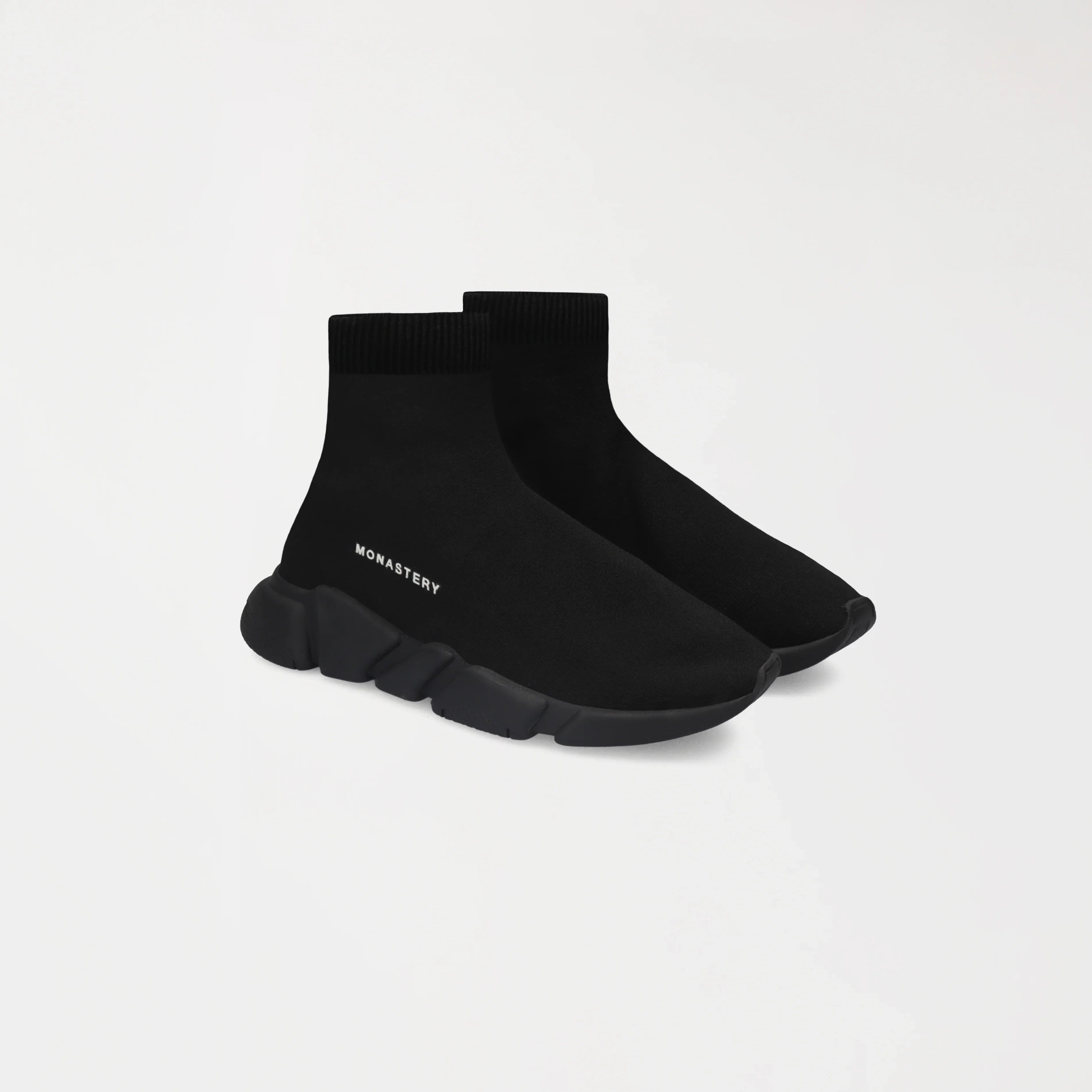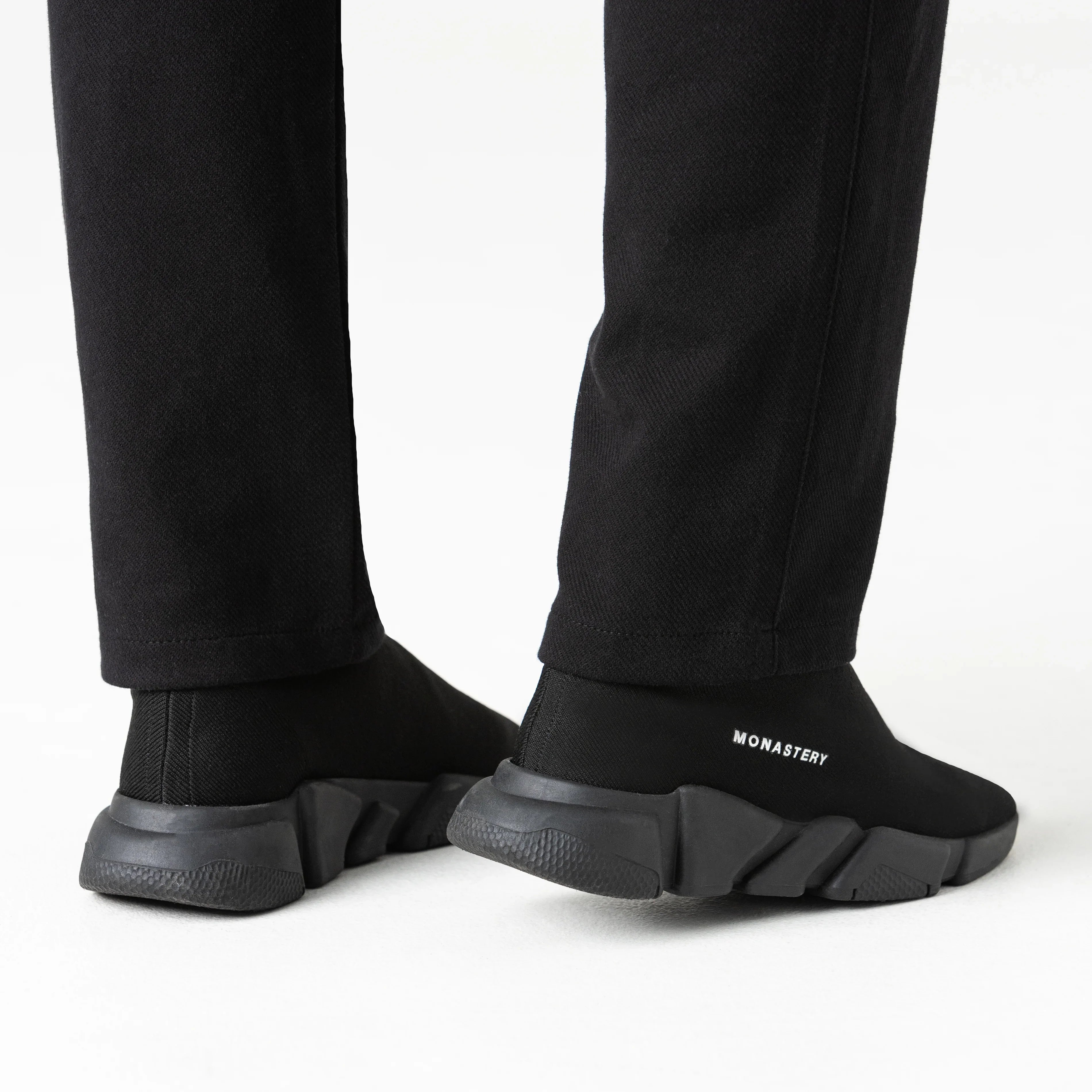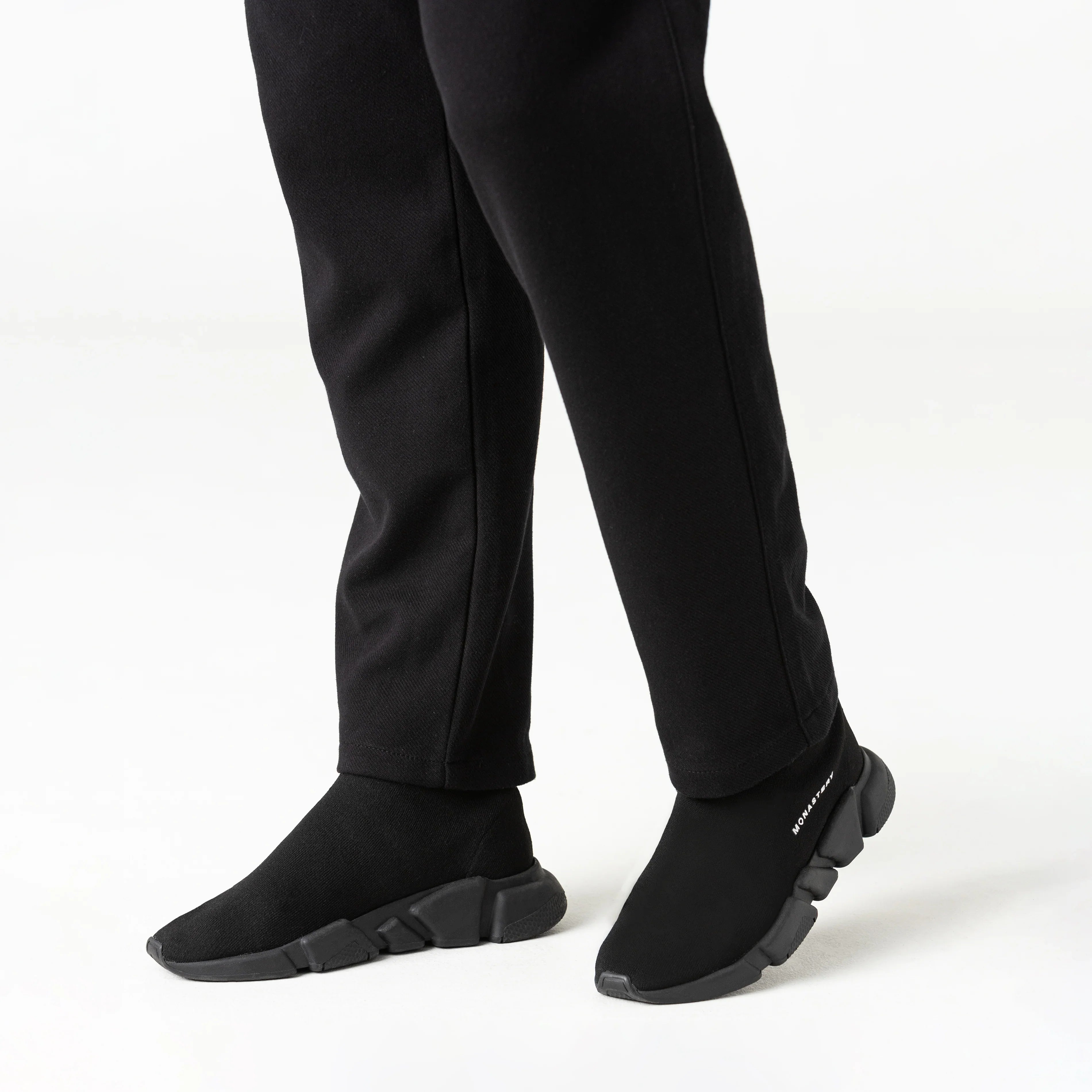 Estos sneakers tipo media presentan un diseño moderno, minimalista y altamente versátil, donde comodidad y estilo convergen en una sola pieza. La parte superior, confeccionada en tejido elástico negro, se adapta al pie con precisión, brindando una sensación de sujeción similar a la de una media y una silueta limpia, dinámica y sin costuras visibles.