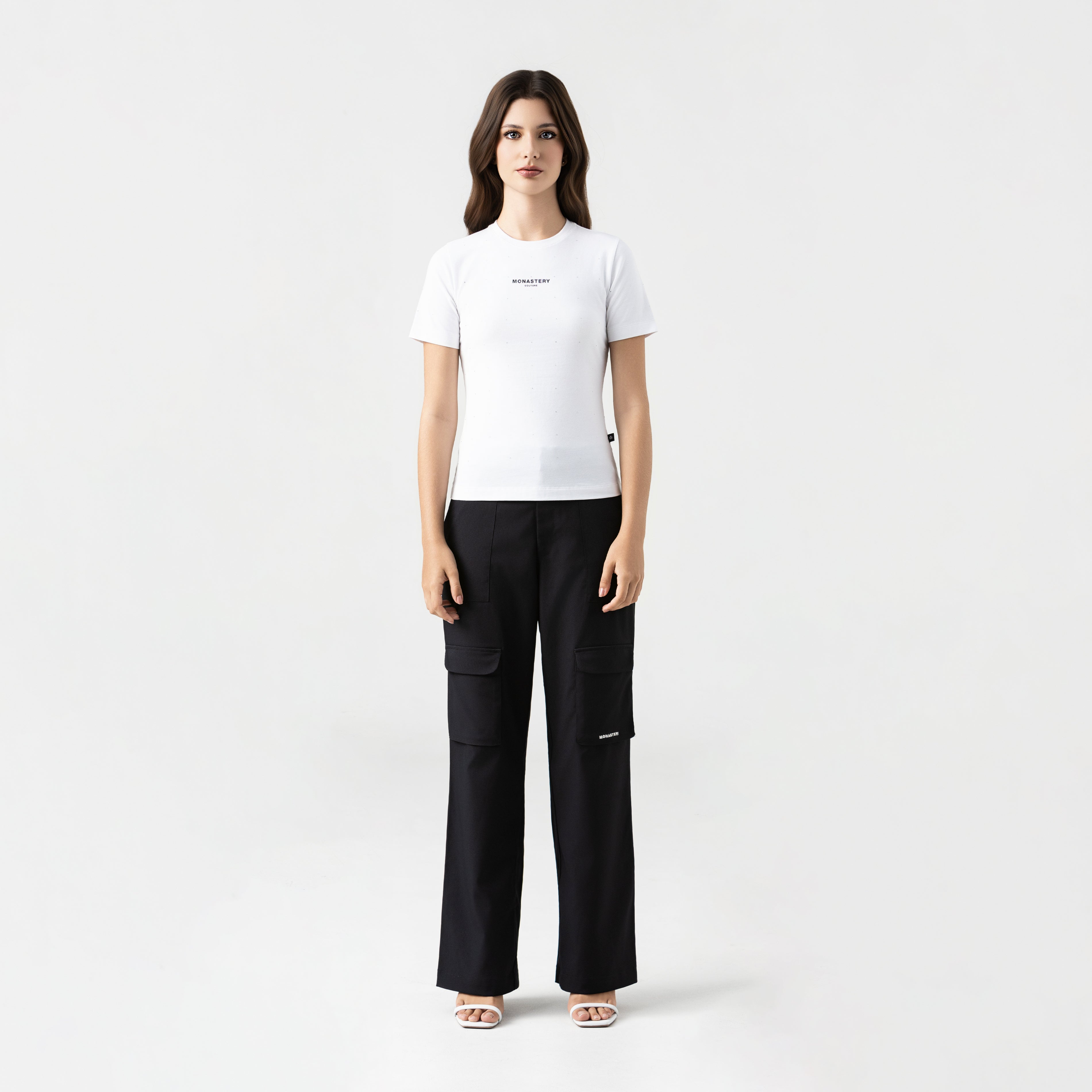 T-shirt femenina elaborada en silueta pequeña pensada para resaltar la figura femenina, atravez de su base textil, fresca y ajustada. Qylla es una referencia intervenida con aplicacion de cristales ubicados de forma continua en toda la prenda, dispuestos con presicion para generar un efecto dinamico, contiene el logo Monastery couture en centro frente en tecnica transfer el cual refuerza el contraste visual sin restarle protagonismo al diseño, la parte posterior cuenta con artes insignia en estampado plano ideal para destacar desde la elegancia.