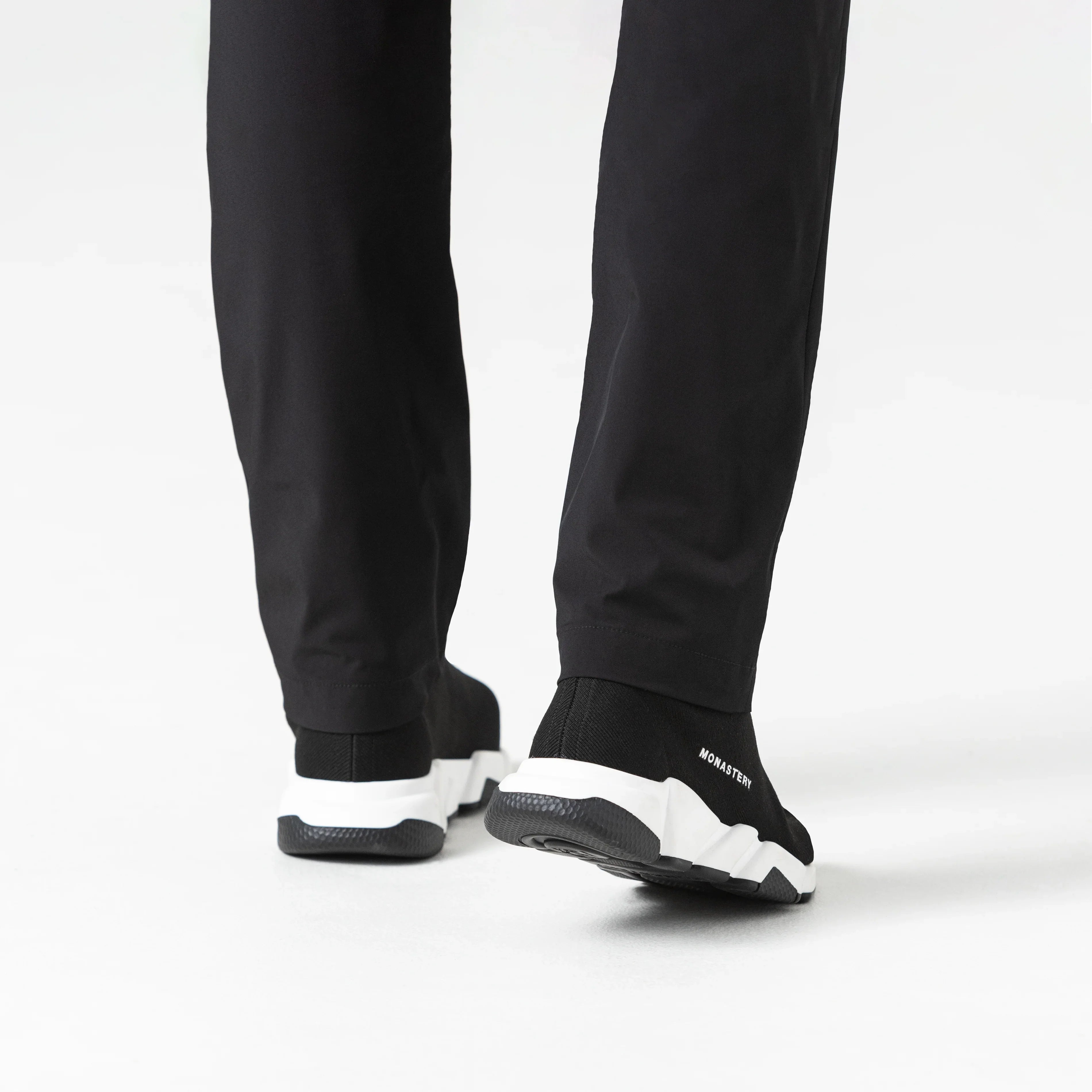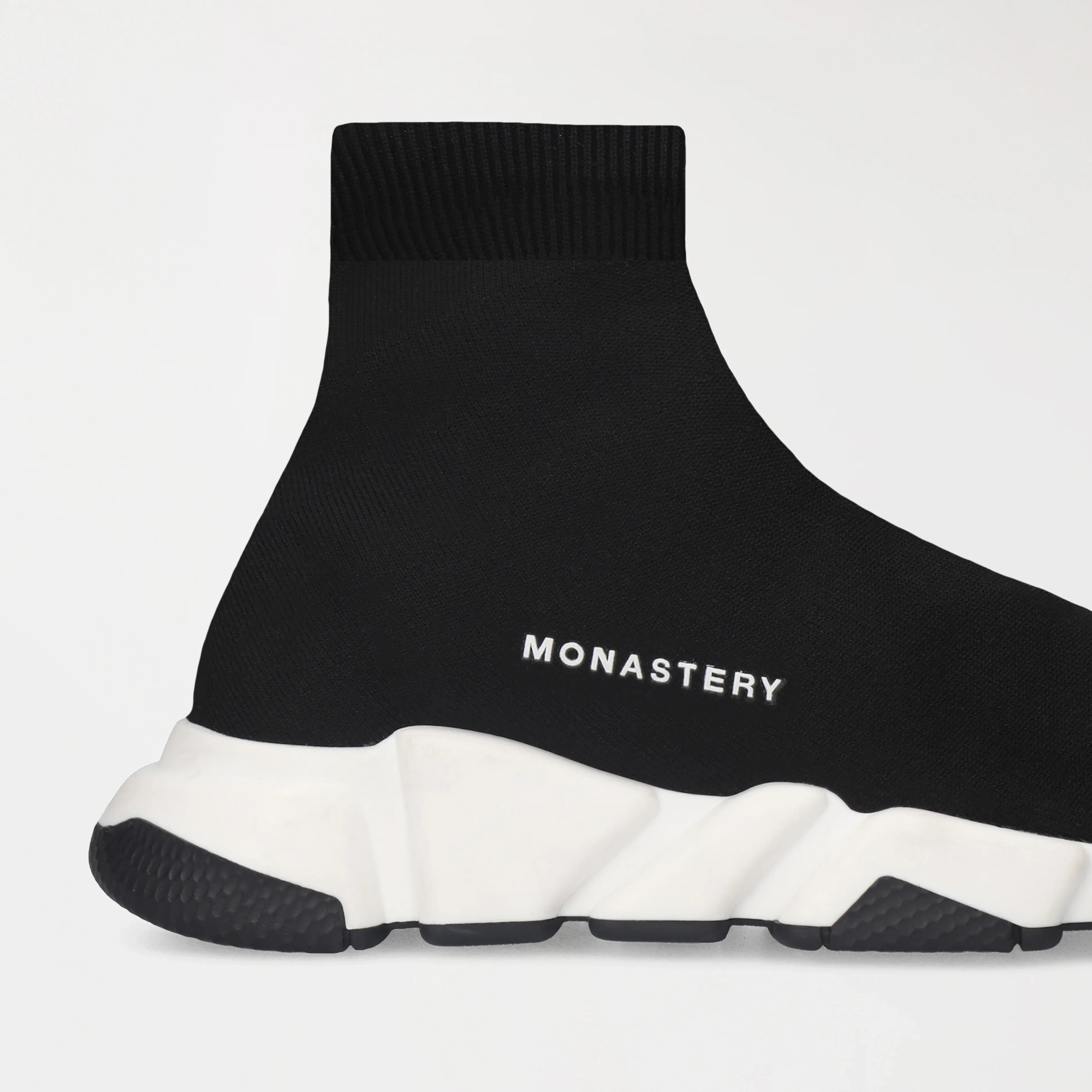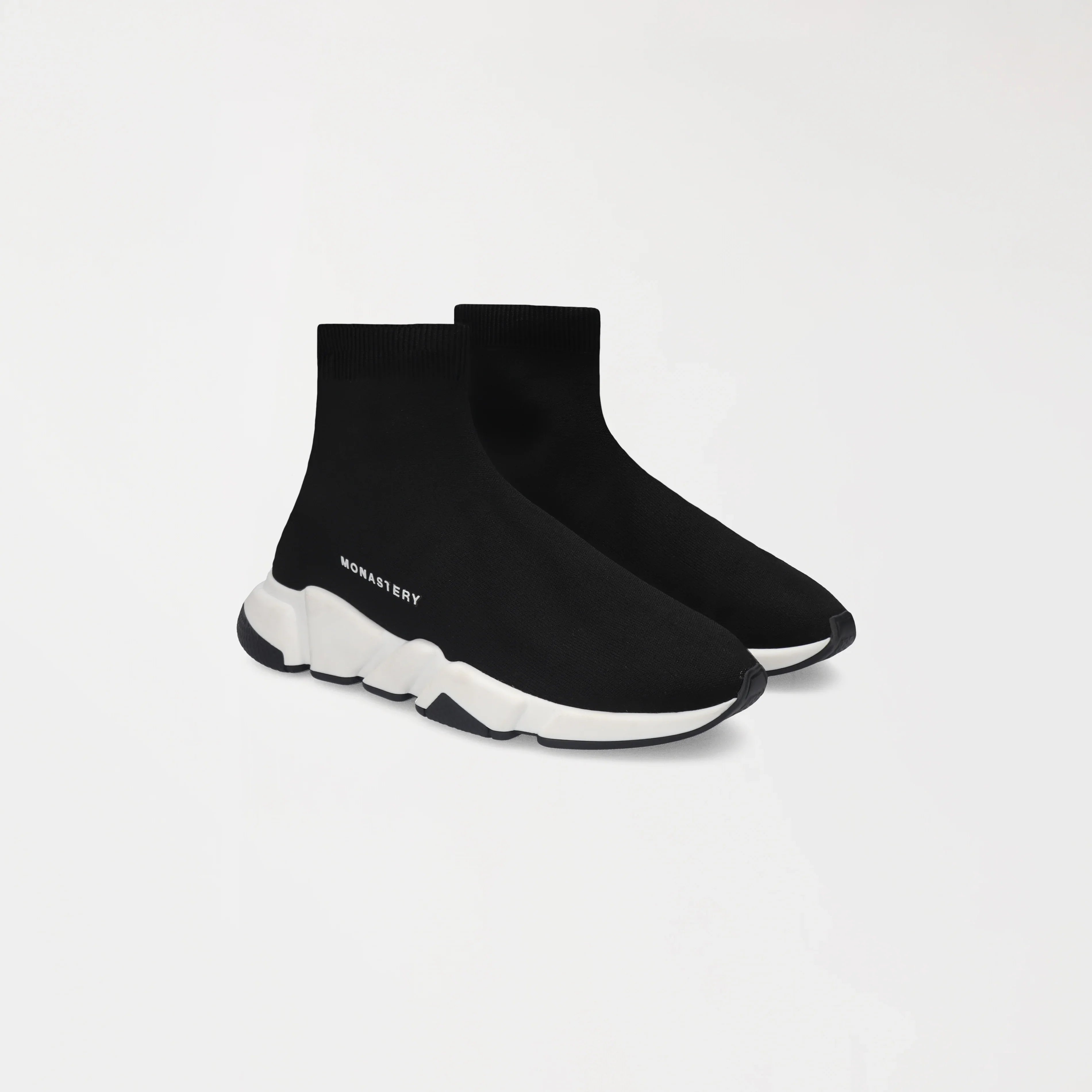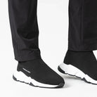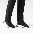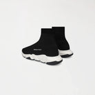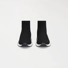 Estos sneakers tipo media presentan un diseño moderno, minimalista y altamente versátil, donde comodidad y estilo convergen en una sola pieza. La parte superior, confeccionada en tejido elástico negro, se adapta al pie con precisión, brindando una sensación de sujeción similar a la de una media y una silueta limpia, dinámica y sin costuras visibles.