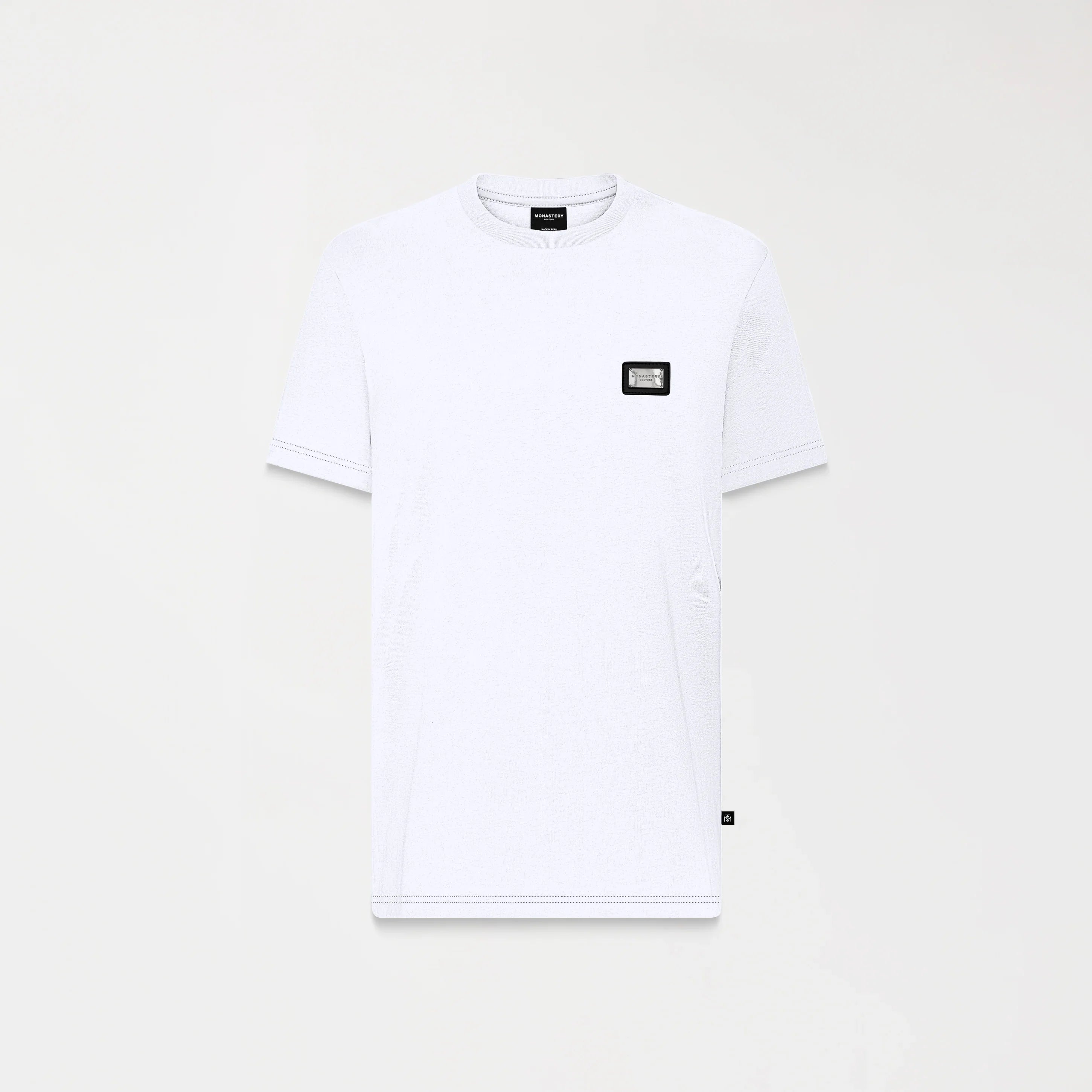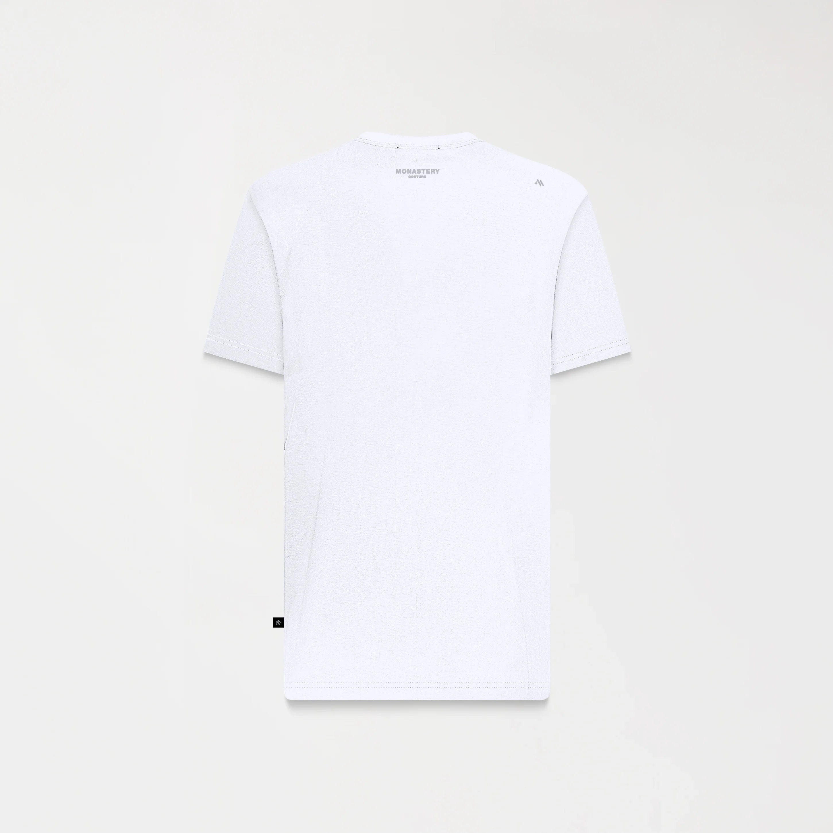 En el frente, un aplique metálico distintivo de la marca aporta carácter y profundidad, convirtiéndose en el punto focal del diseño. En la espalda, los logos insignia se presentan mediante técnica de estampado plano, logrando un acabado limpio y atemporal que refuerza la identidad exclusiva de Monastery.