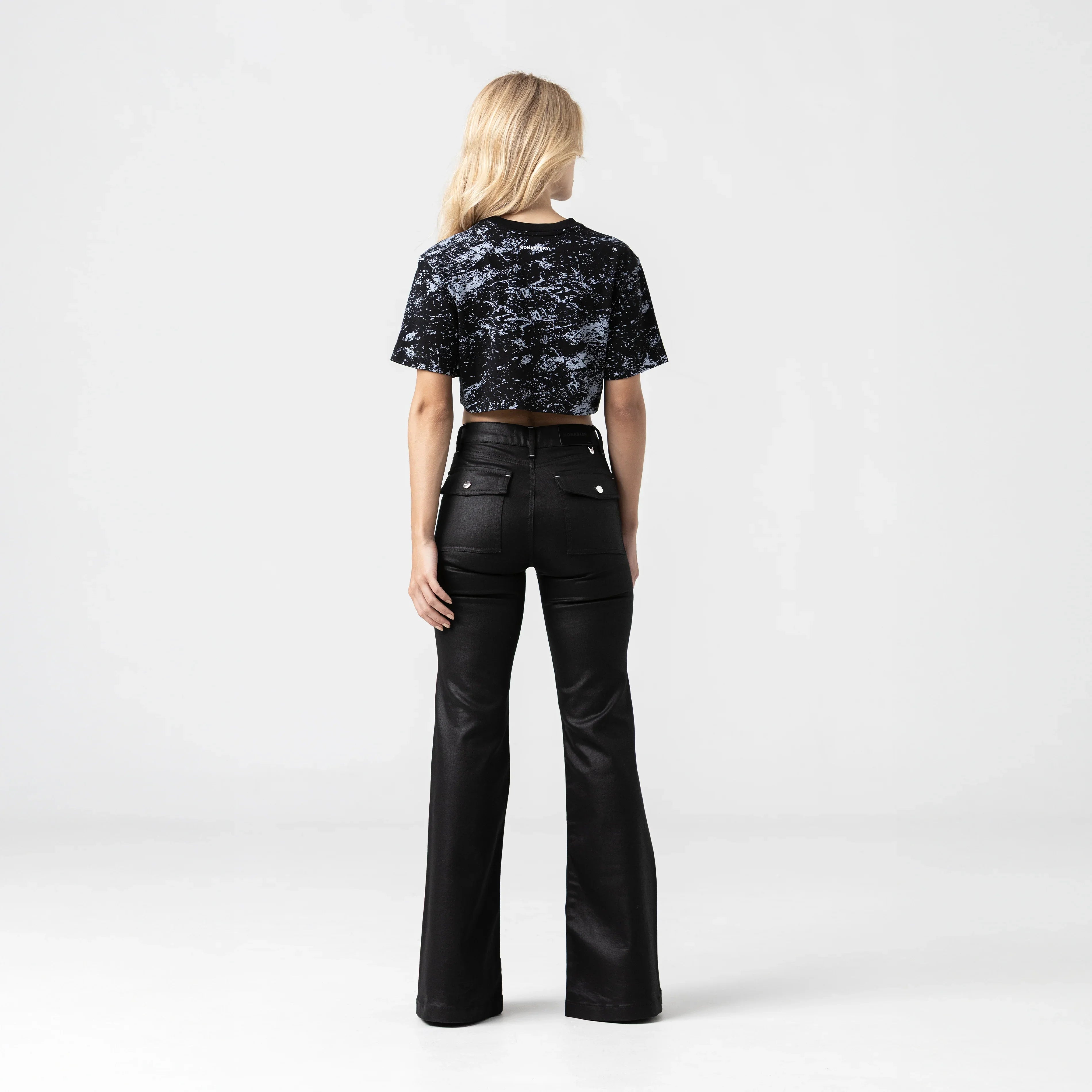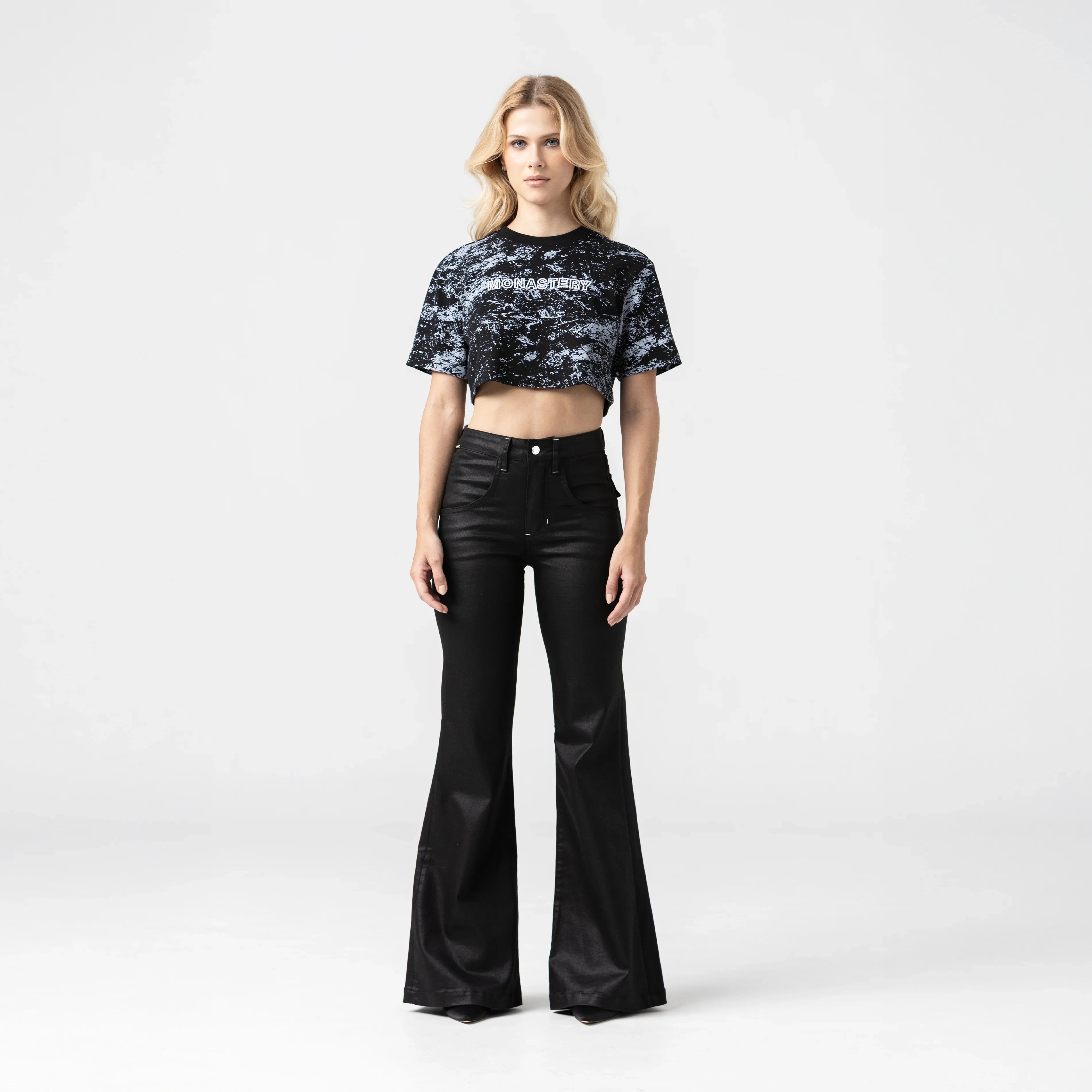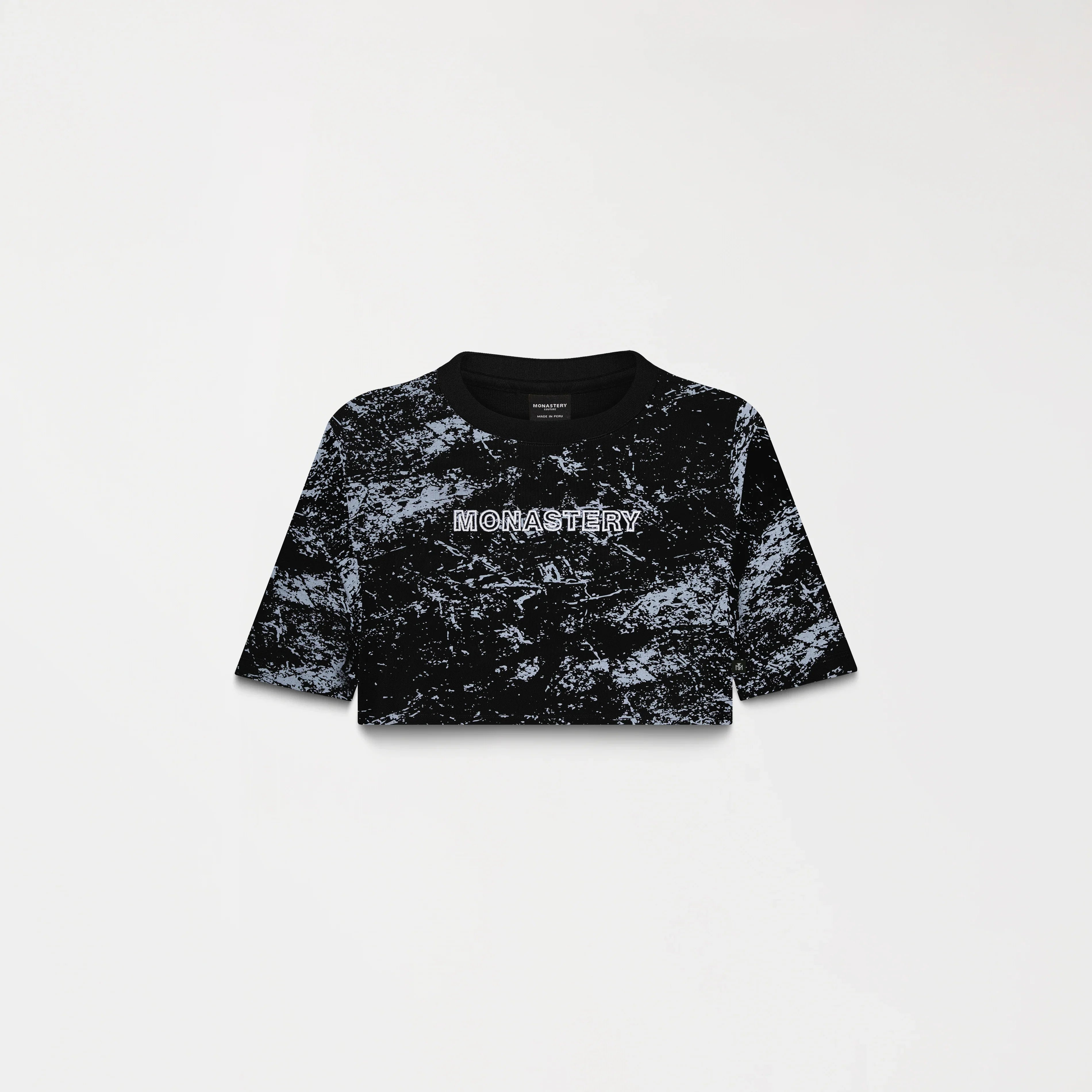 Crop top para mujer en algodón peruano exclusivo para Monastery, silueta pequeña de estilo holgado y corto lo hace ideal para un look fresco y casual, presenta un fondo en allover print que aporta un diseño dinámico y moderno. El outline en bordado 3D resalta sutilmente en todo el contorno, creando una textura única que da profundidad y sofisticación a la prenda.