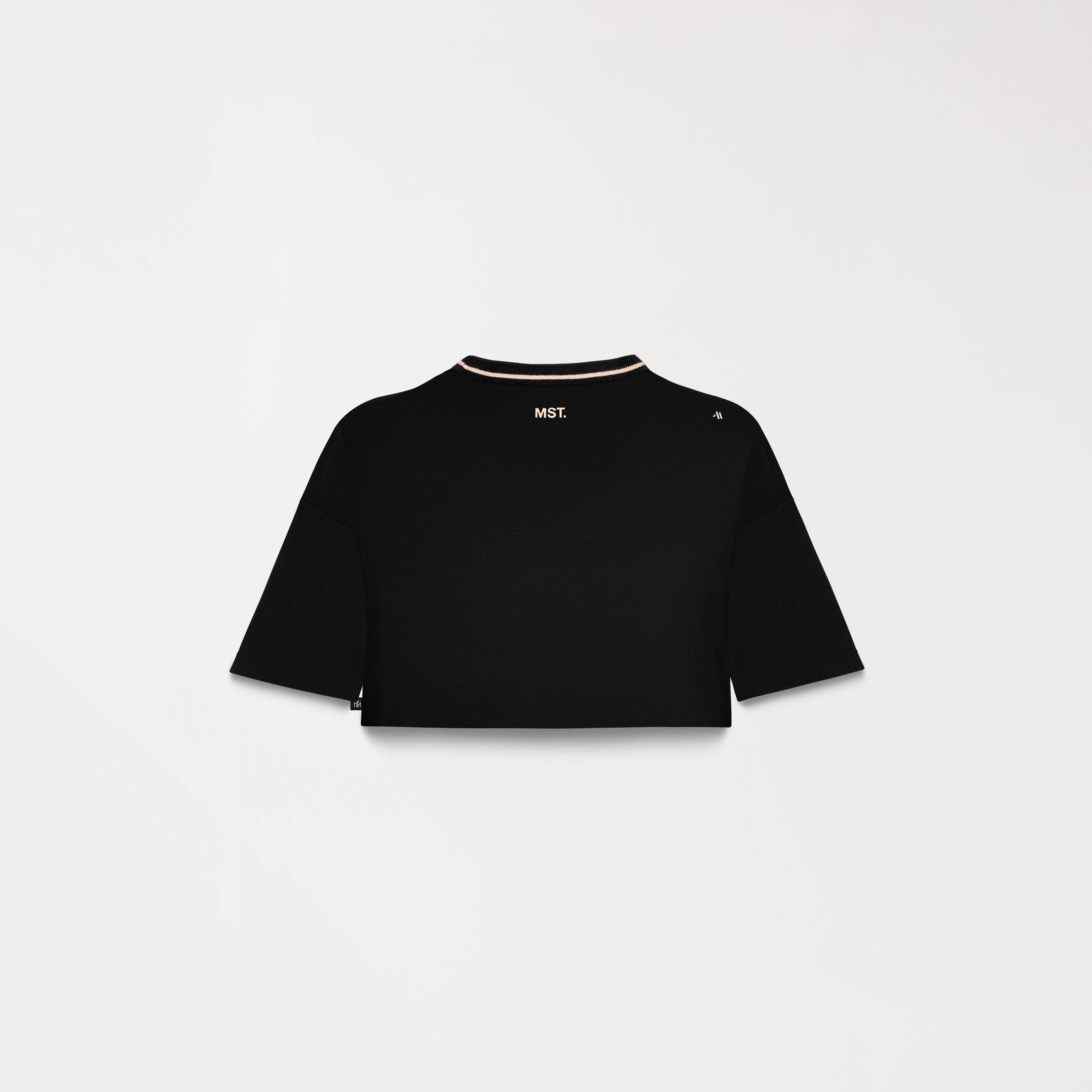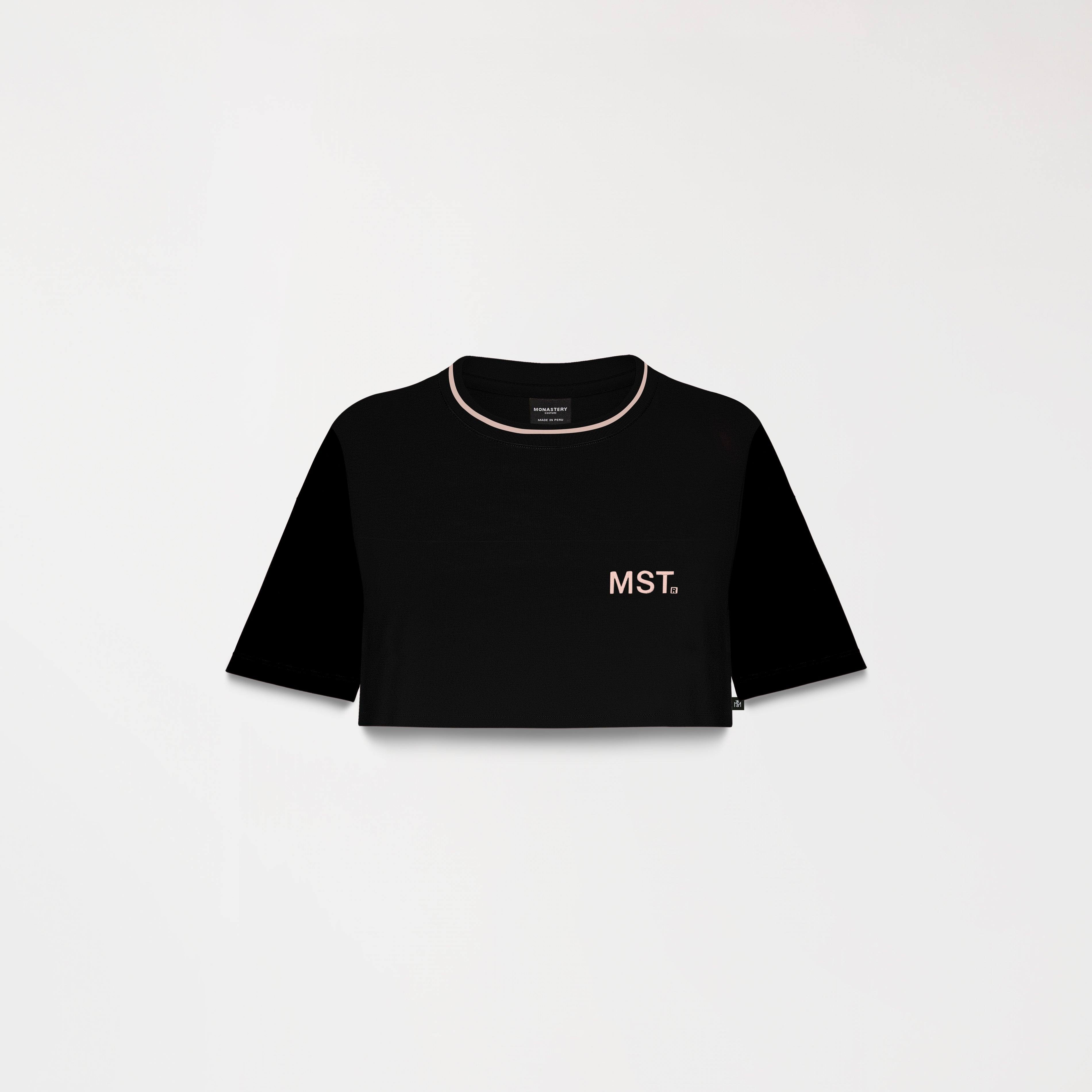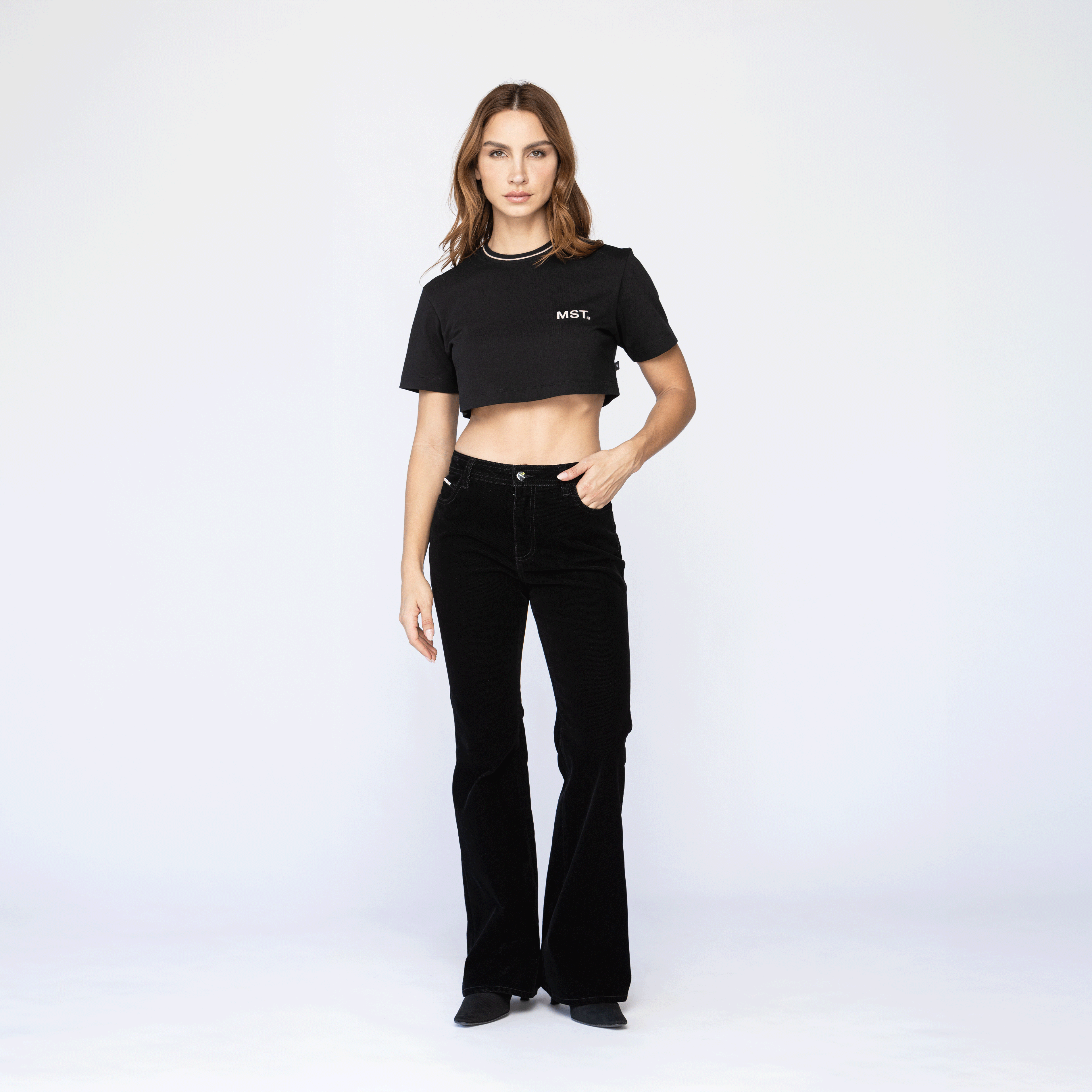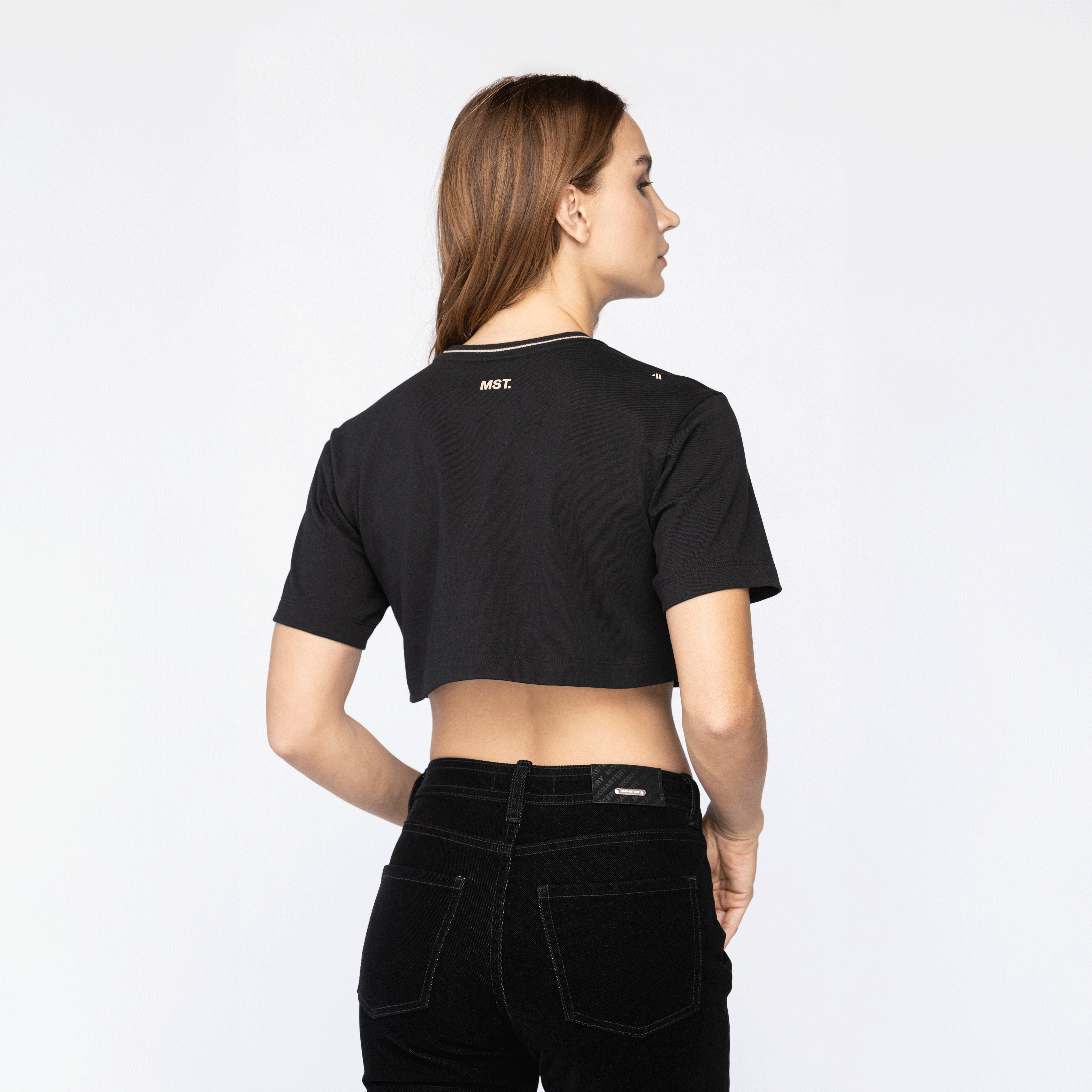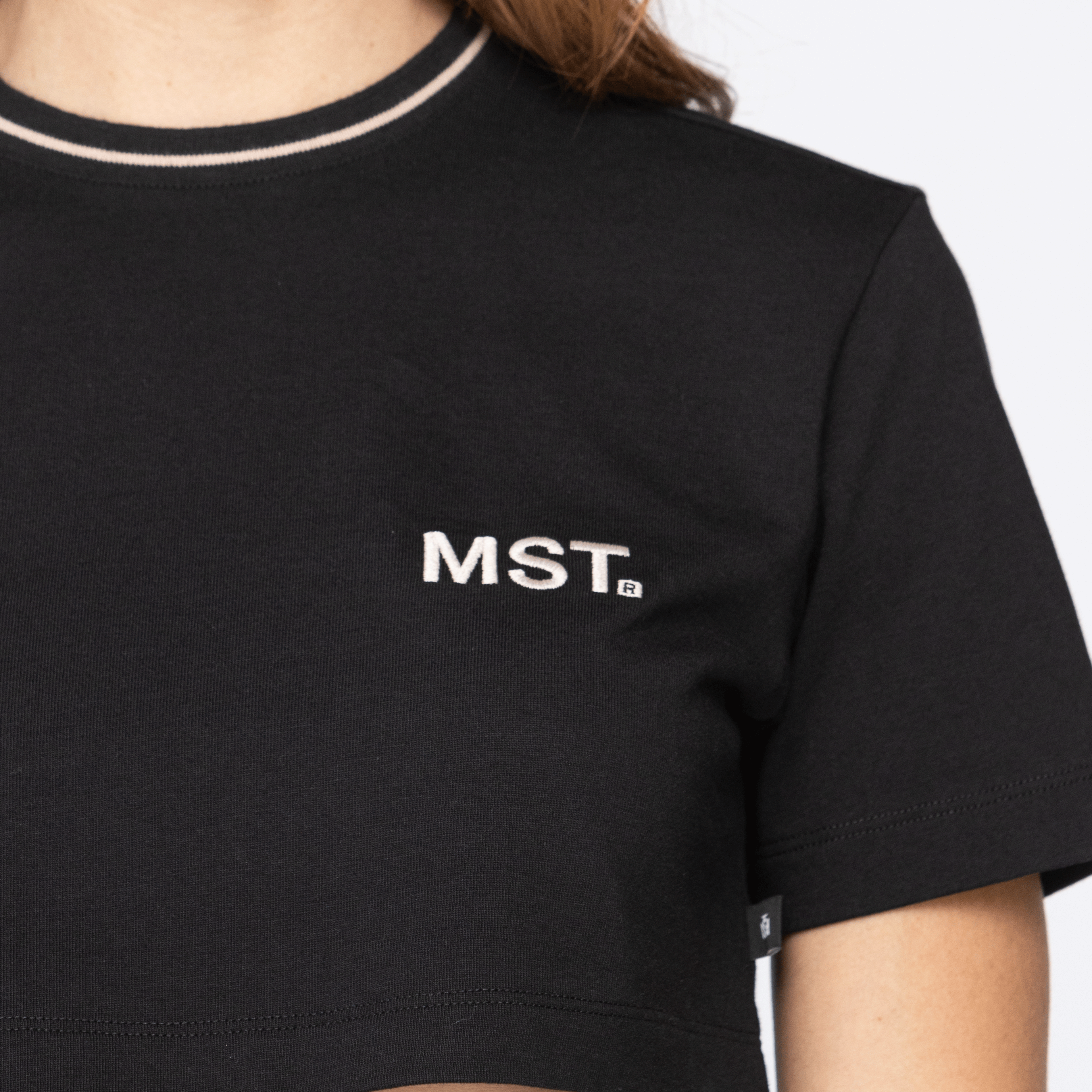 Crop top femenino en algodón 100% exclusivo para Monastery, elaborada en silueta pequeña, Elden presenta un bordado en punto corazón del icónico logo MST, el cual añade un relevante toque de la identidad de marca, esta referencia tiene cuello en tejido rectilíneo la cual es una opción versátil, perfecta para combinar con una variedad de atuendos.